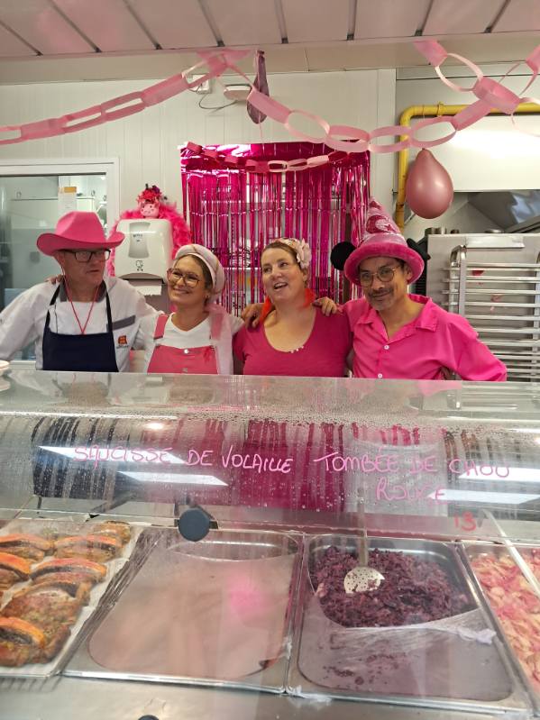La sensibilisation au cancer du sein dans le cadre d'Octobre rose a pris la forme d'un repas entièrement aux couleurs de cette campagne mondiale. Merci à toute l'équipe cuisine pour la préparation et la décoration du self qui est devenu le temps d'un midi un espace porteur de sens et de solidarité.
