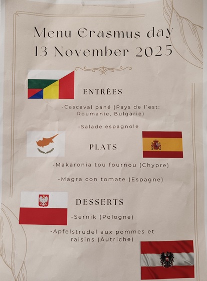 Comme chaque année, les Erasmus days sont fêtés au lycée par le biais d'un repas aux saveurs européennes. Il constitue l'aboutissement d'un travail en classe mené par les élèves de bac pro AGoRa et leurs professeures Mme Lerouvillois en anglais et Mme Conche en enseignement professionnel.